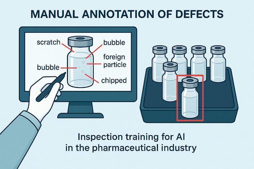 Consider a visual inspection system for vials or bottles. Before AI can be used in production, it must be trained on a large number of images.
